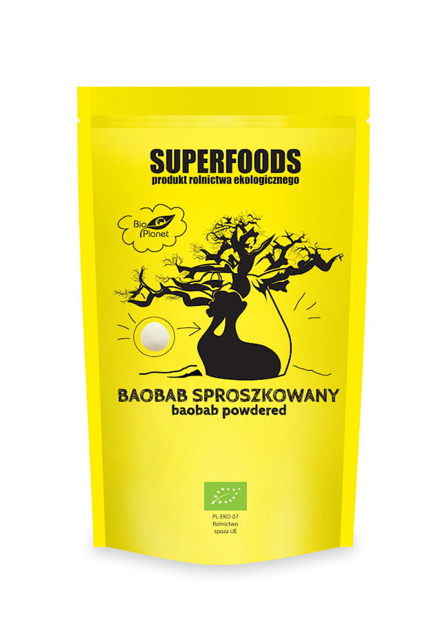 Ekologiczny sproszkowany baobab powstaje ze zmielonego miąższu owoców baobabu. Od setek lat stanowi ważny element diety w krajach Afryki. Charakteryzuje się kwaśnym, lekko cierpkim smakiem. Stanowi doskonałe źródło błonnika pokarmowego. Polecamy jako dodatek do koktajli, soków, sałatek, jogurtów i innych deserów.