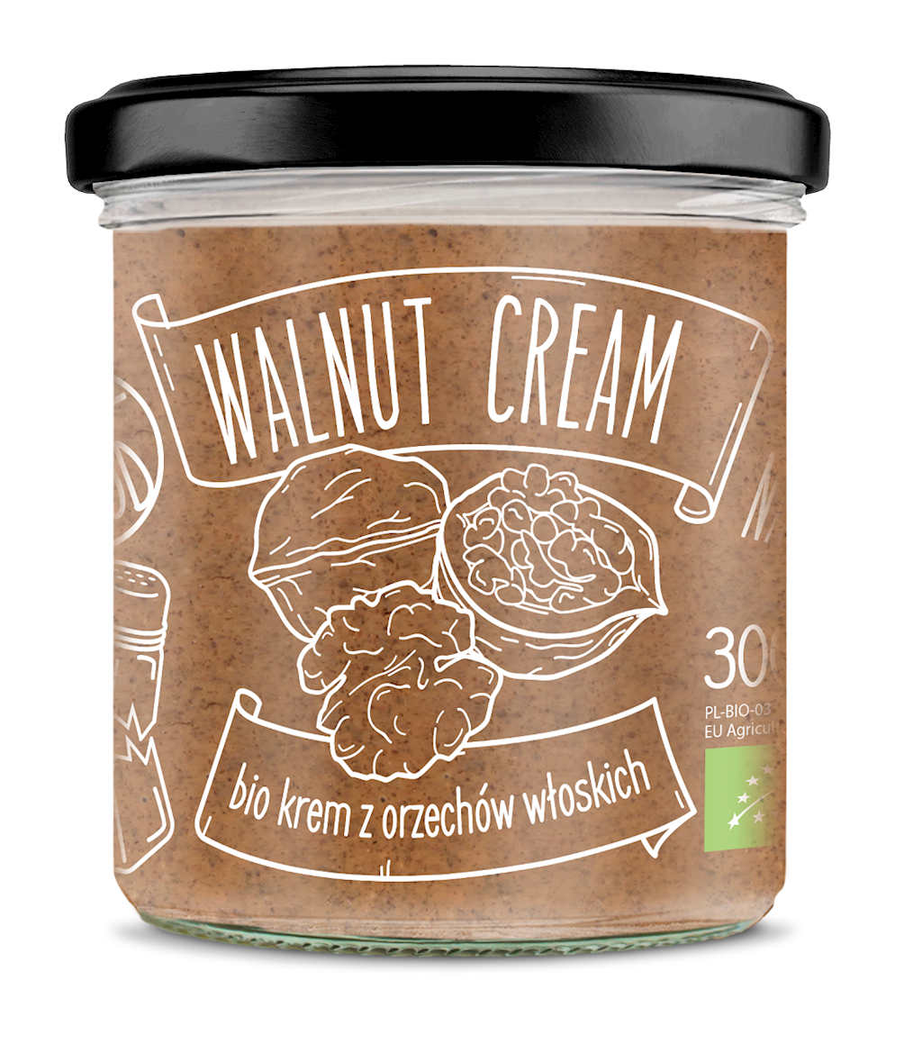 Naturalny, certyfikowany ekologicznie krem z orzechów włoskich, bez żadnych dodatków, przygotowane jedynie z prażonych orzechów.